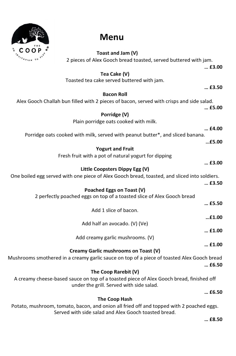 Start your day with comforting options like Poached Eggs on Toast or a warm Bacon Roll. For those with a sweeter tooth, the Toast and Jam or a slice of delicious Tea Cake won't disappoint. Families will appreciate the Little Coopsters Dippy Egg and homemade sausages, paired with fresh salads like the Buddha Bowl. The Crown Jewel? The rich and flavorful Coop Rarebit.